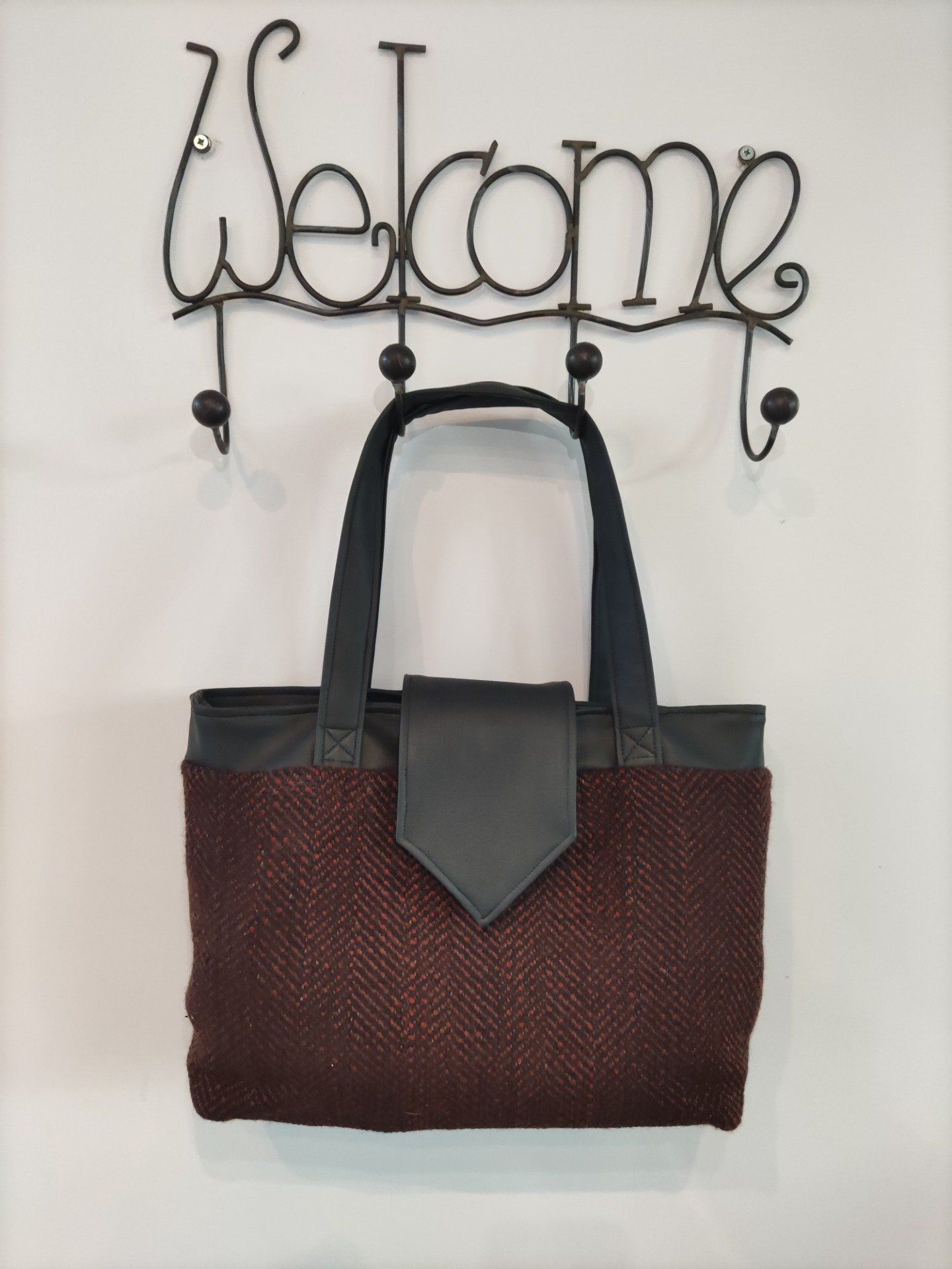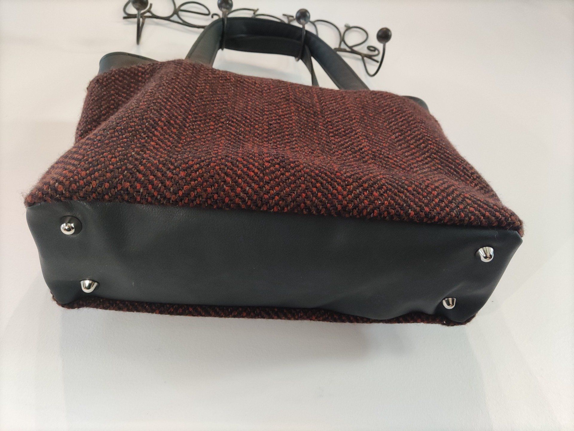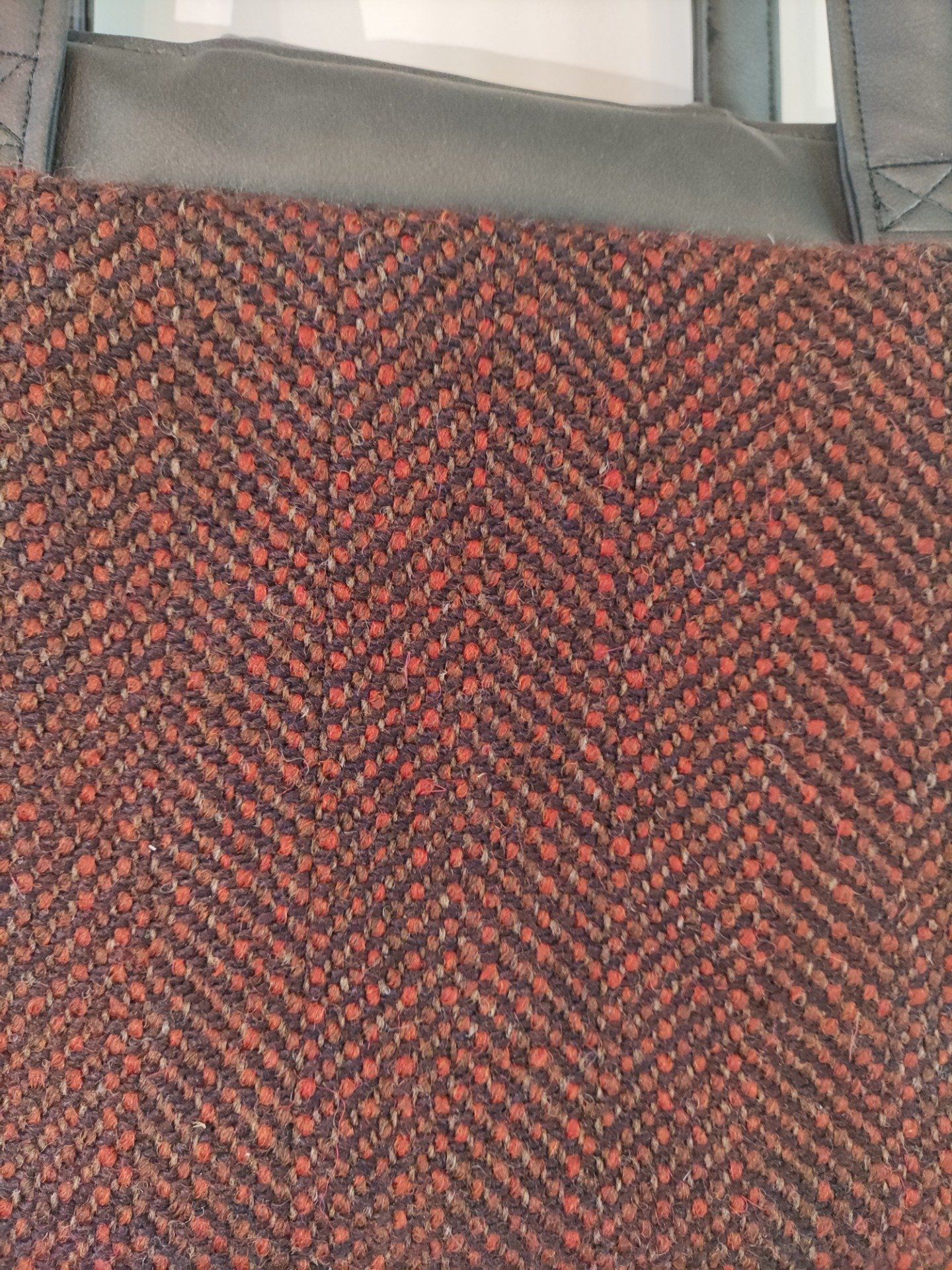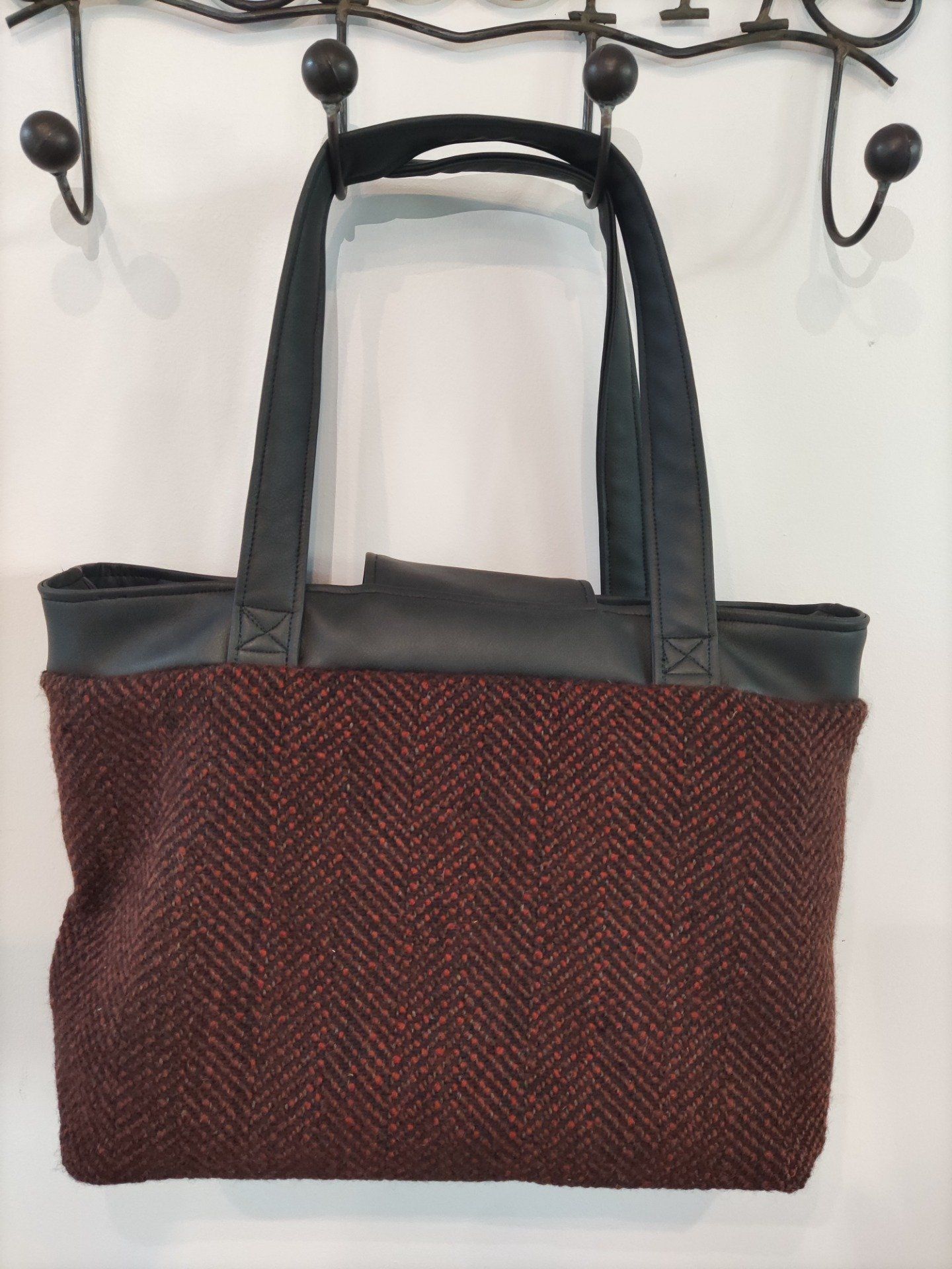 Madison est un élégant sac compartimenté avec un design soigné, cousu dans un simili souple et un joli lainage chevrons noir et tomette.