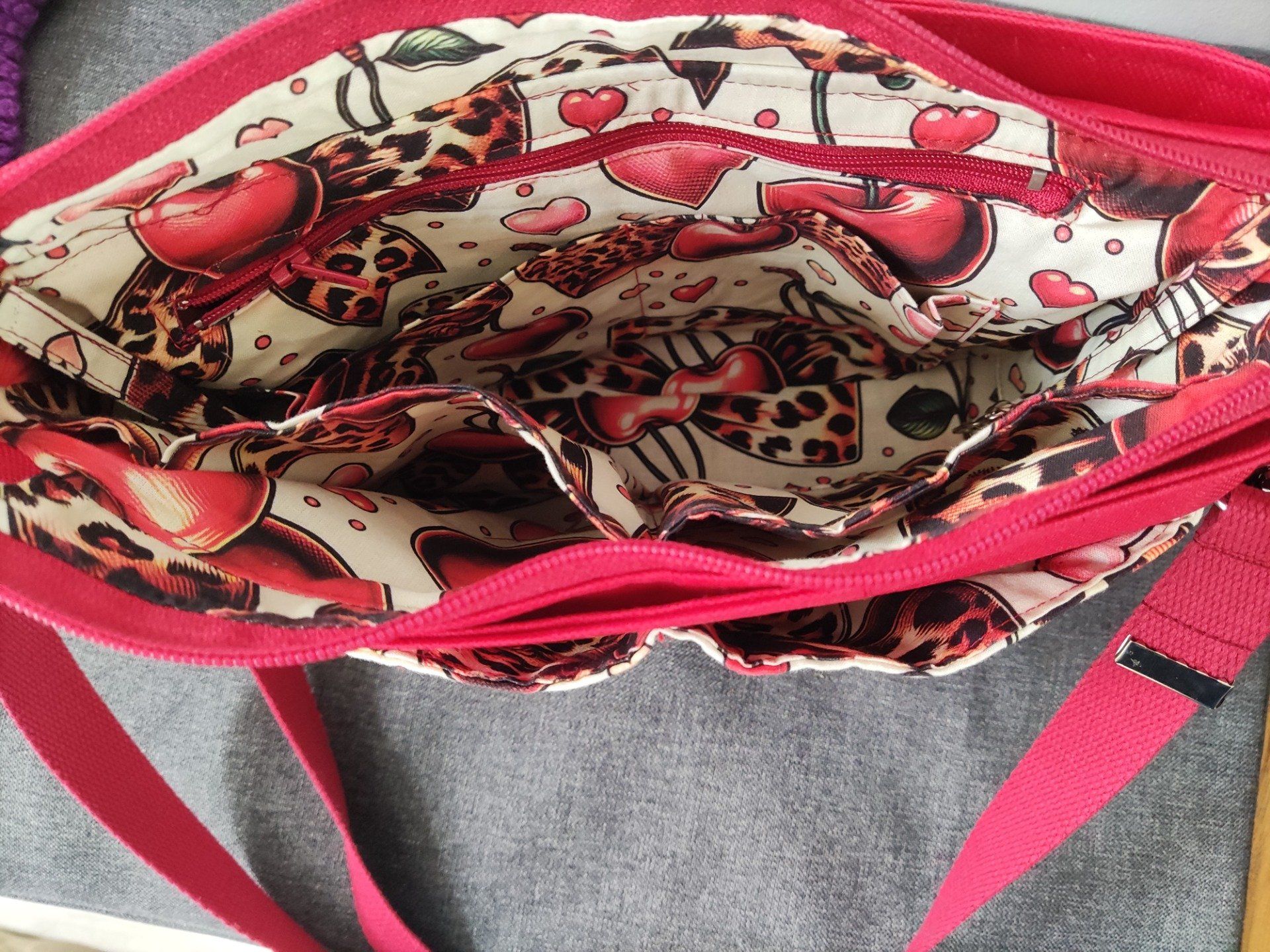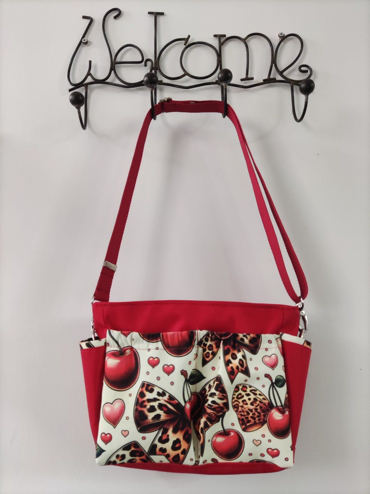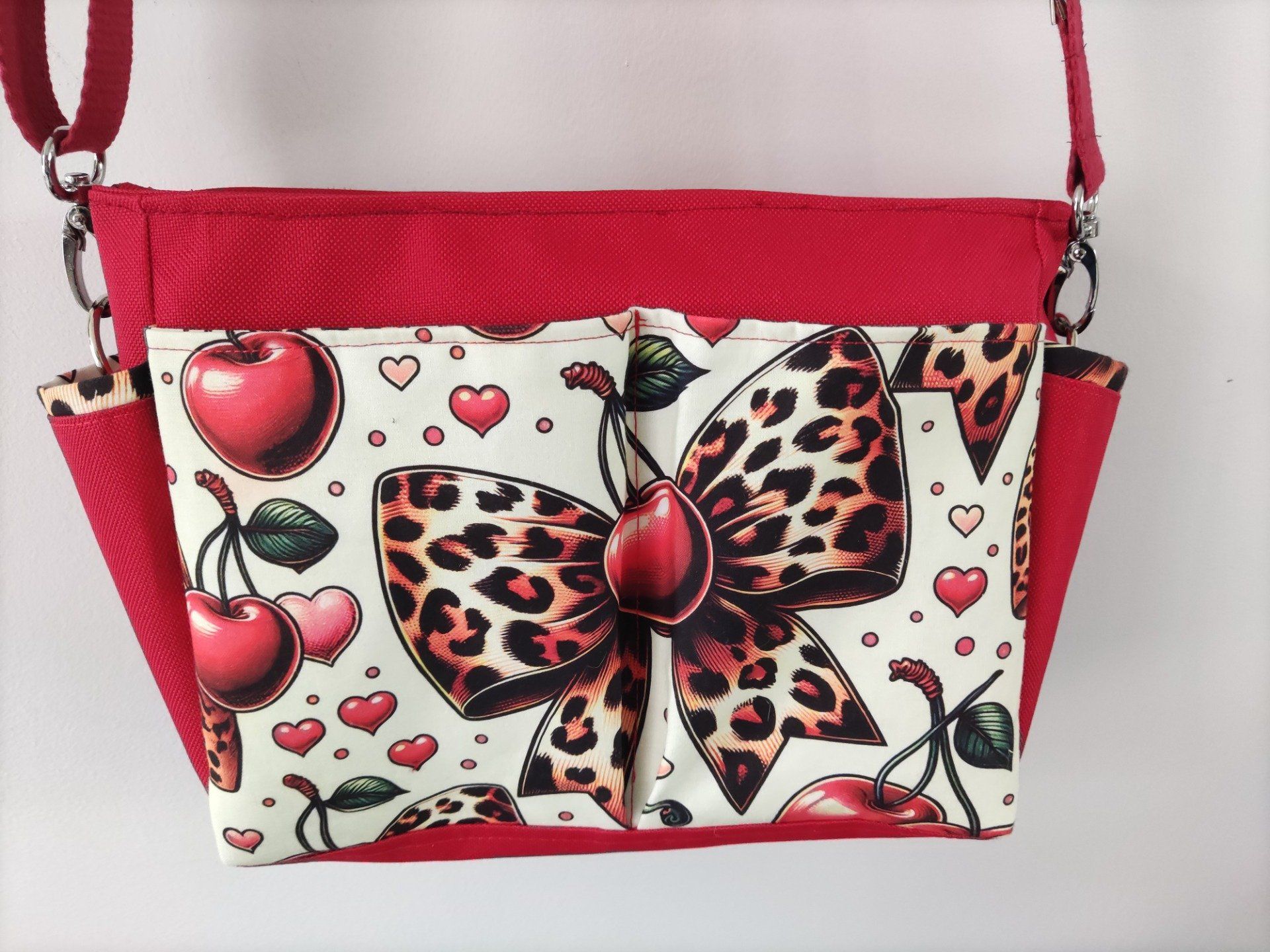 Découvrez Triôtin, l’organisateur de sac zippé, qui peut aussi se transformer en petit sac bandoulière en fixant simplement la sangle à l'aide des mousquetons. Cousu dans une jolie toile à sac rouge, et avec un imprimé noeud léopards cerise, vous serez dans la tendance de la saison.